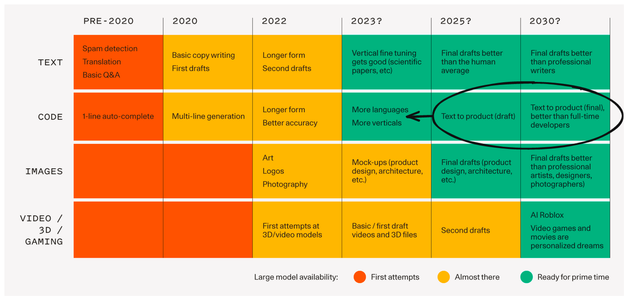 Sequoia’s generative AI market map from September 2022 thought text to product was 2025-2030. But it’s emerging today.